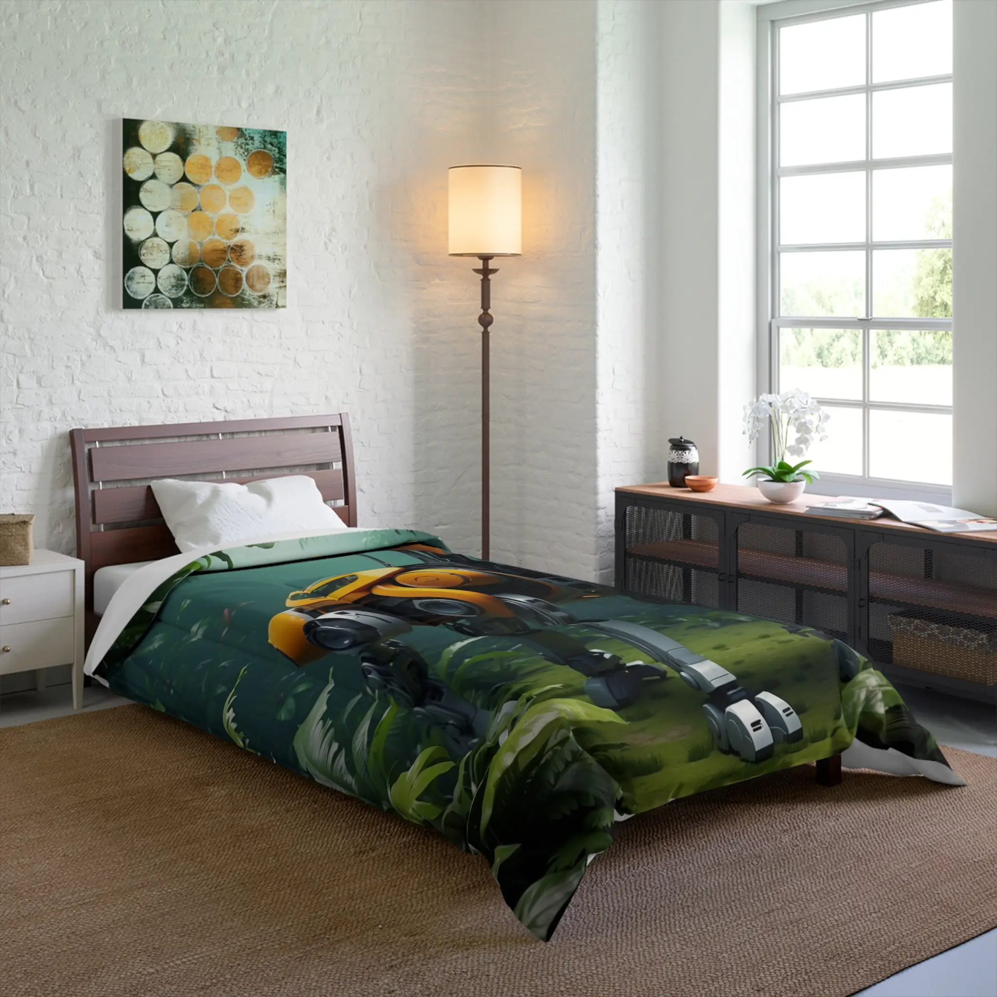 Transform your bedroom into a blend of nature and technology with the Robotic Animal Comforter from Exyashop. This striking comforter features a captivating design of a futuristic robotic animal set against a lush, green backdrop, offering a unique fusion of the natural world and advanced technology.