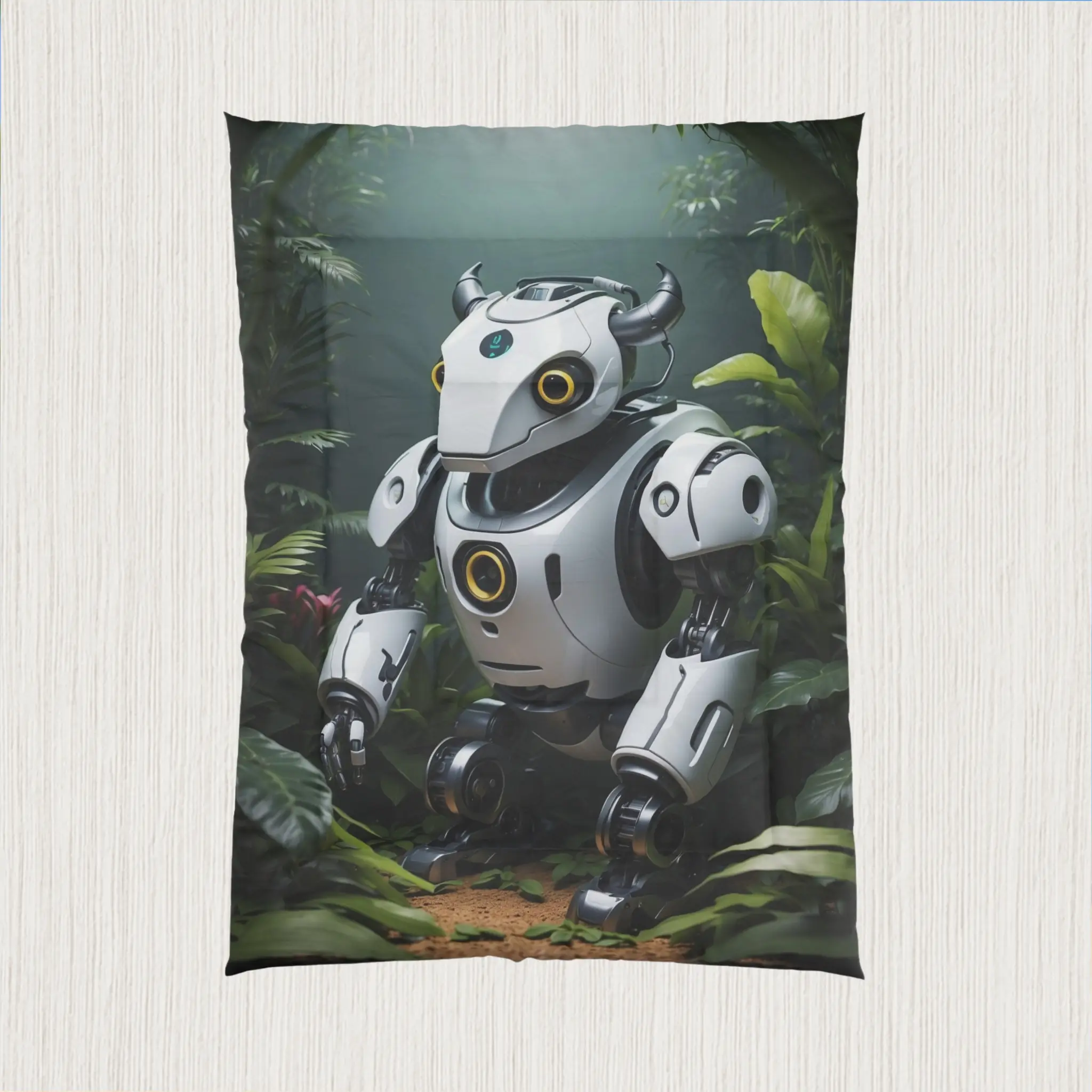 The Robotic Animal Comforter captures the essence of a future where the boundaries between the natural world and advanced robotics blur. The detailed depiction of the robotic creature amidst a vibrant, forested landscape creates a striking contrast, inviting you to explore the possibilities of a tech-enhanced wilderness. This comforter is not just bedding; it’s a conversation starter and a piece of art that adds depth and intrigue to your space.