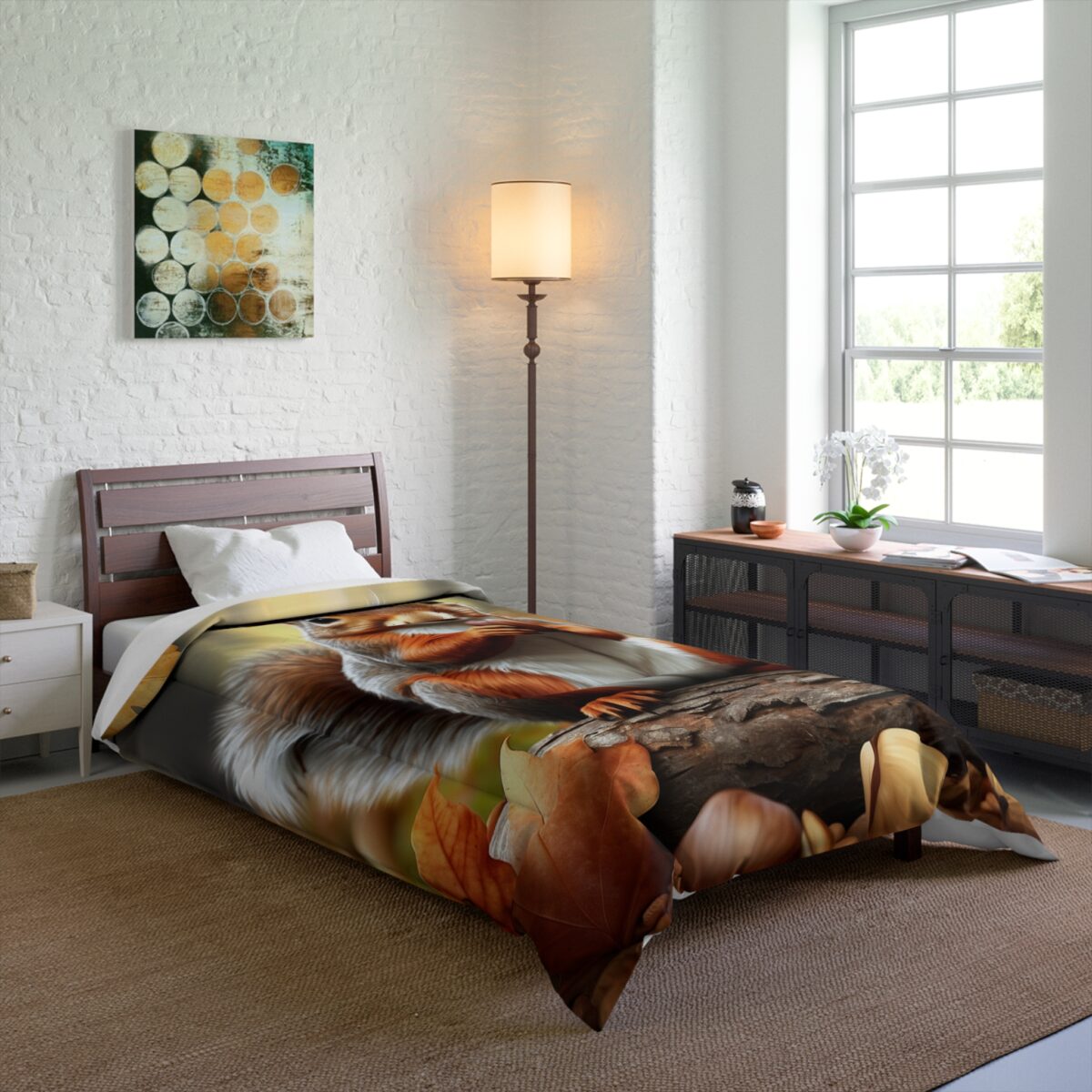 Our Squirrel Comforter captures the playful spirit of a woodland creature in its natural habitat. The detailed design showcases a cute squirrel, happily holding an acorn amidst a backdrop of rich autumn colors. This comforter not only adds a touch of nature to your bedroom but also infuses it with a sense of joy and warmth, making it a perfect addition for anyone who loves the great outdoors.