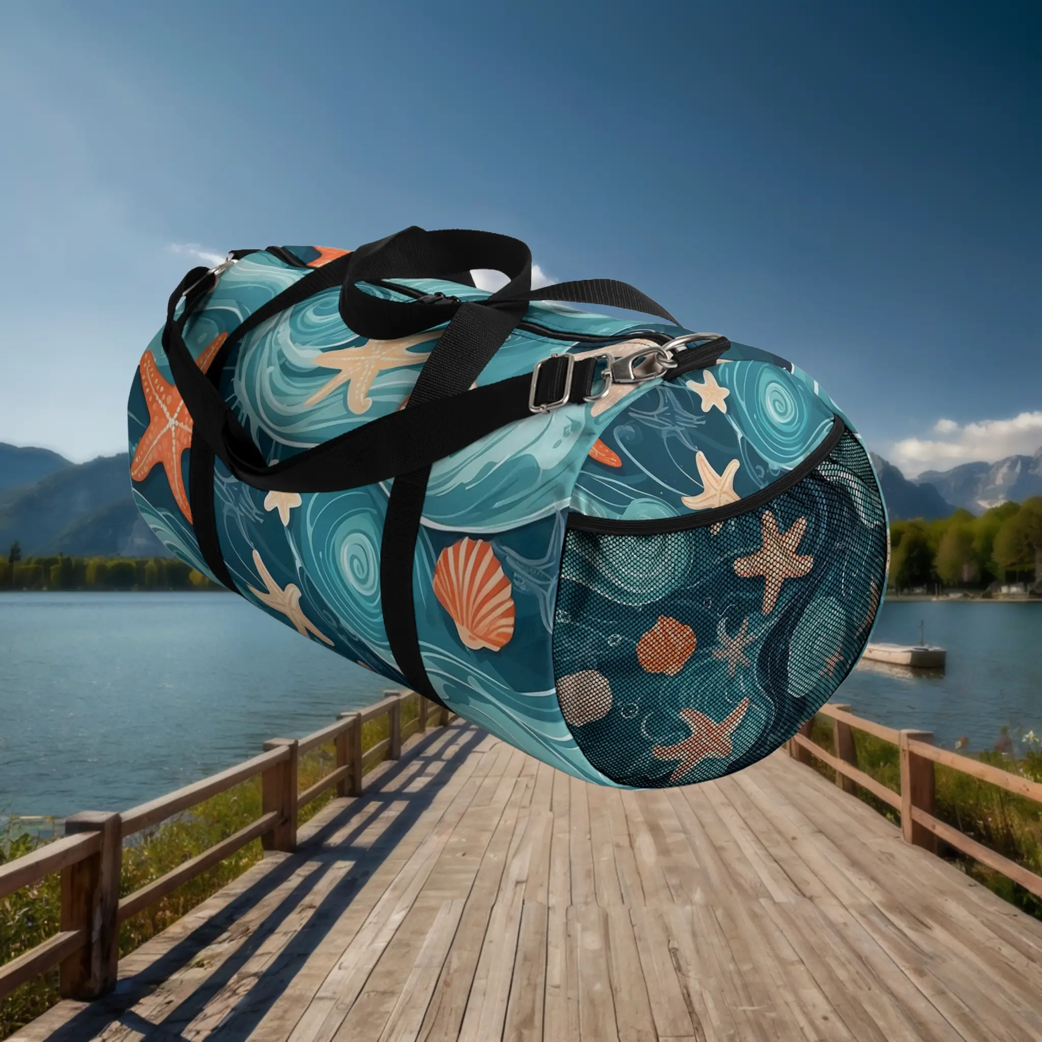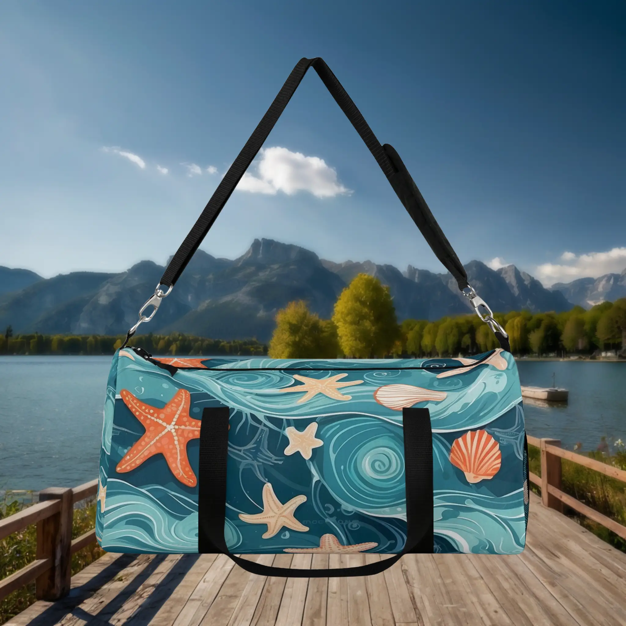 Bring the calming beauty of the ocean into your daily life with the Wave Pattern Duffel Bag from Exyashop. Featuring a stunning design of swirling waves, starfish, and seashells in soft blues and warm corals, this bag is perfect for those who love nature-inspired styles. Ideal for the gym, travel, or daily errands, this duffel combines a serene aesthetic with ample storage space and practical features.