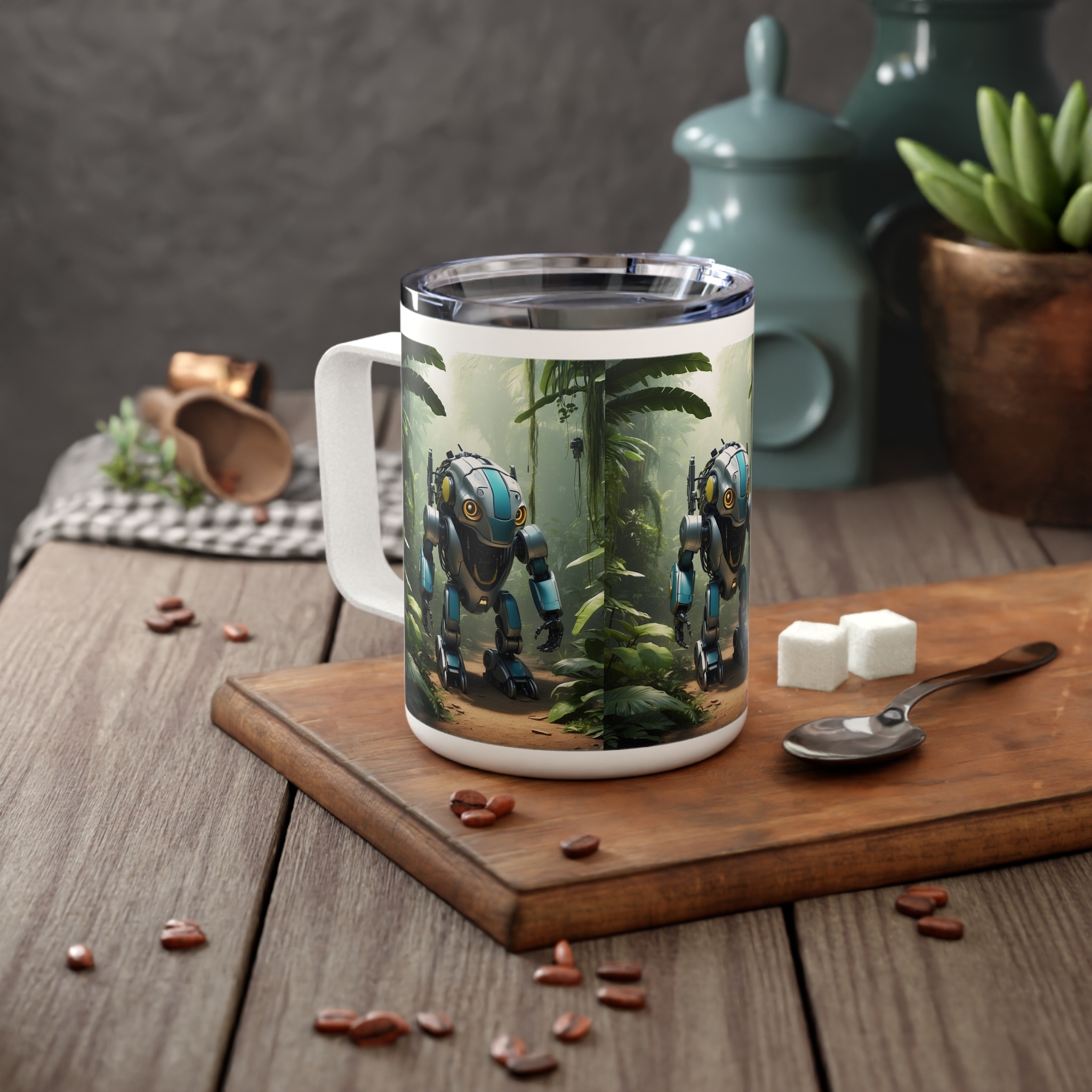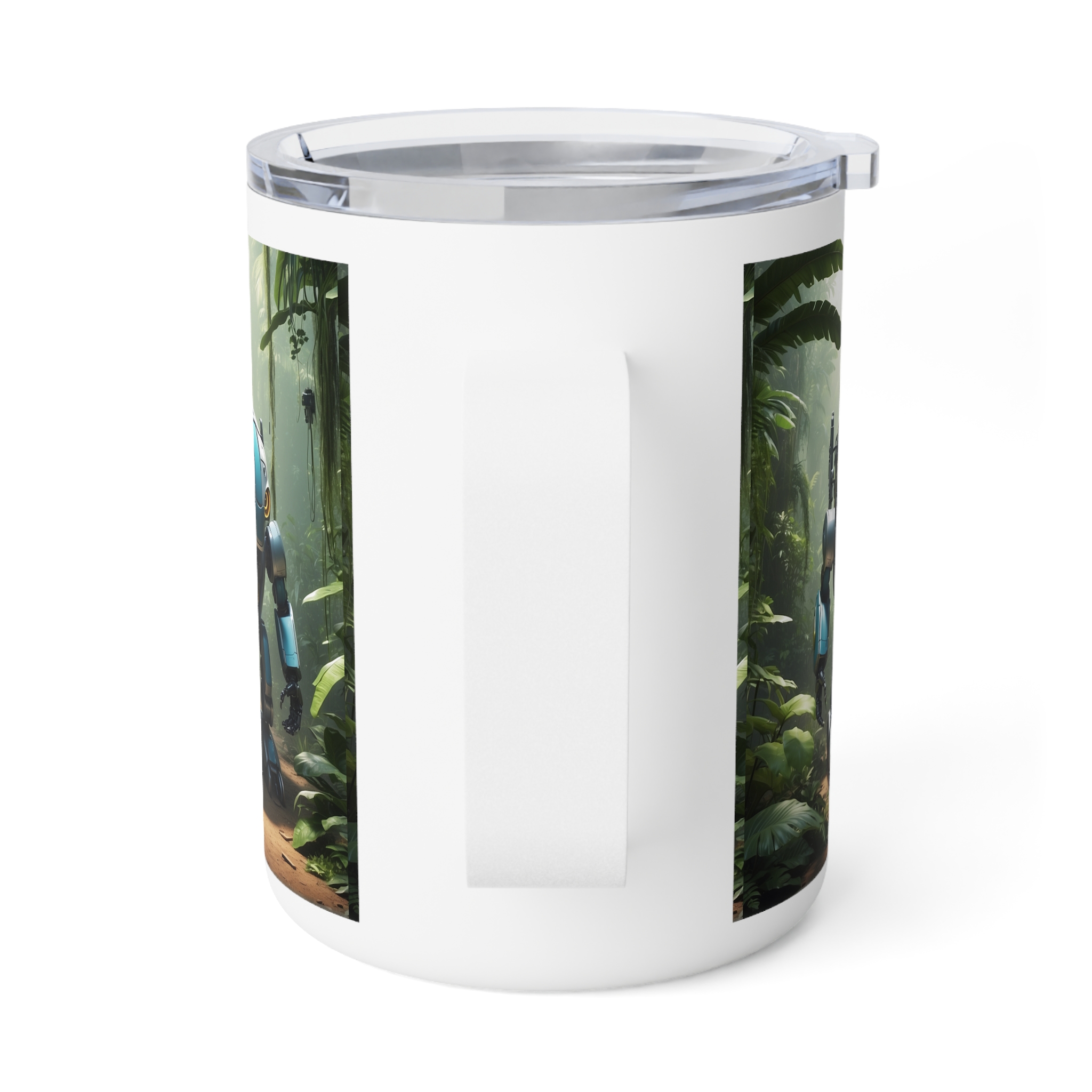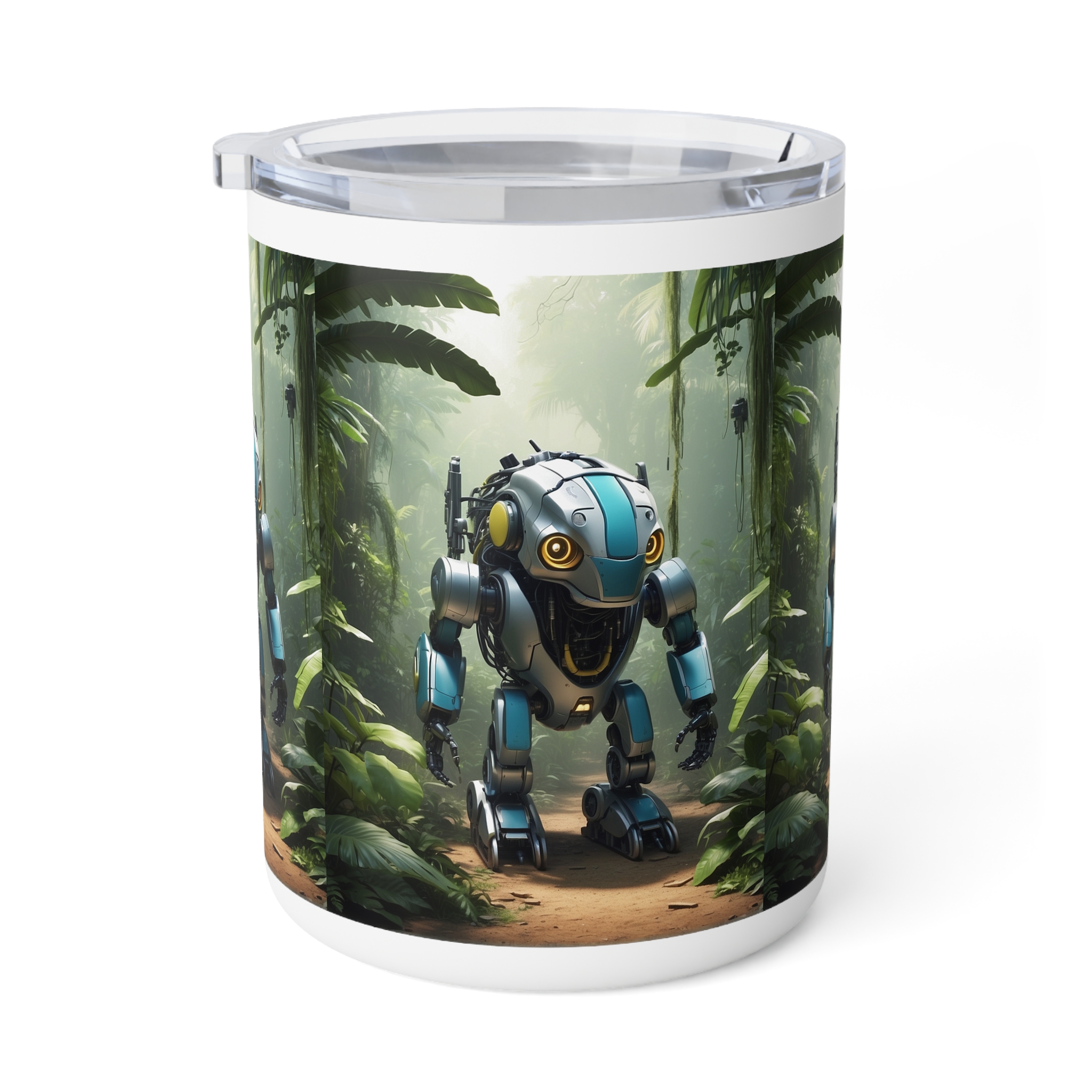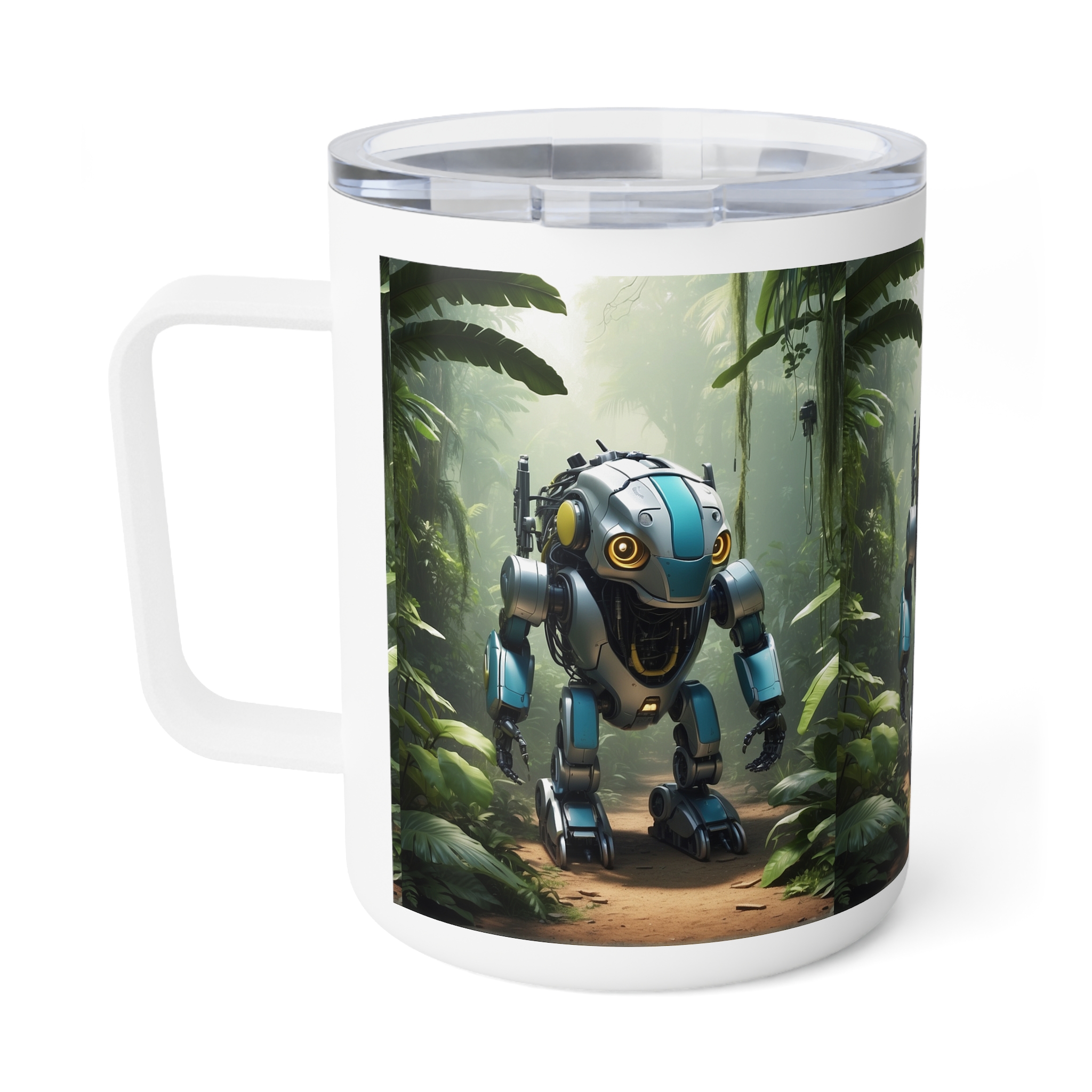 Step into the future of nature and technology with this Insulated Coffee Mug, 10oz, featuring a unique robotic animal design set in a lush jungle. Perfect for sci-fi fans, futurists, and anyone who loves imaginative art, this mug combines bold creativity with everyday functionality to keep your drinks hot and fresh.