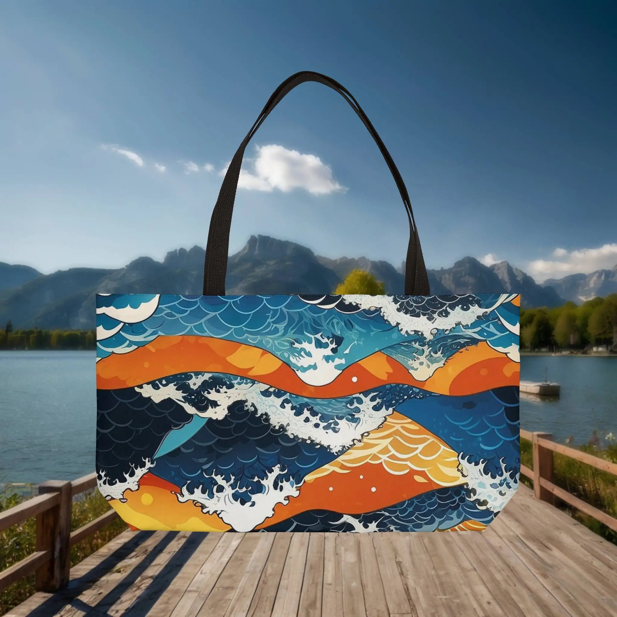 Stylish weekender tote bag featuring a bold Japanese wave design