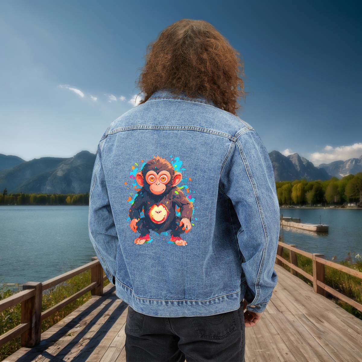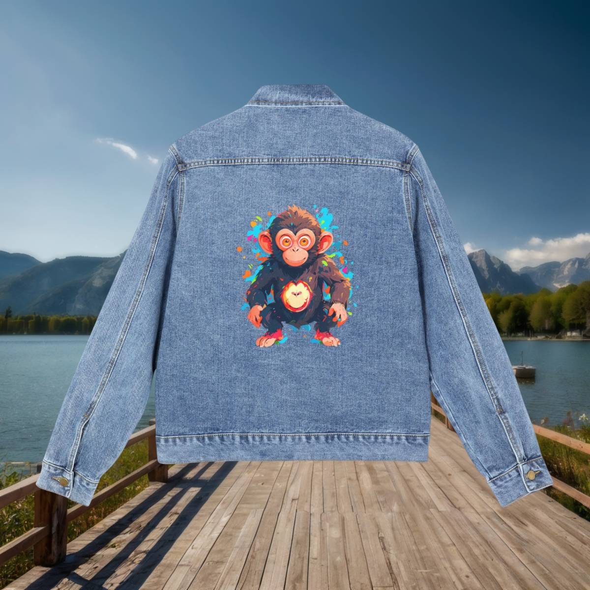 This men’s denim jacket with a colorful monkey graphic design offers a unique blend of playfulness and style. Perfect for those who appreciate fun and meaningful fashion.