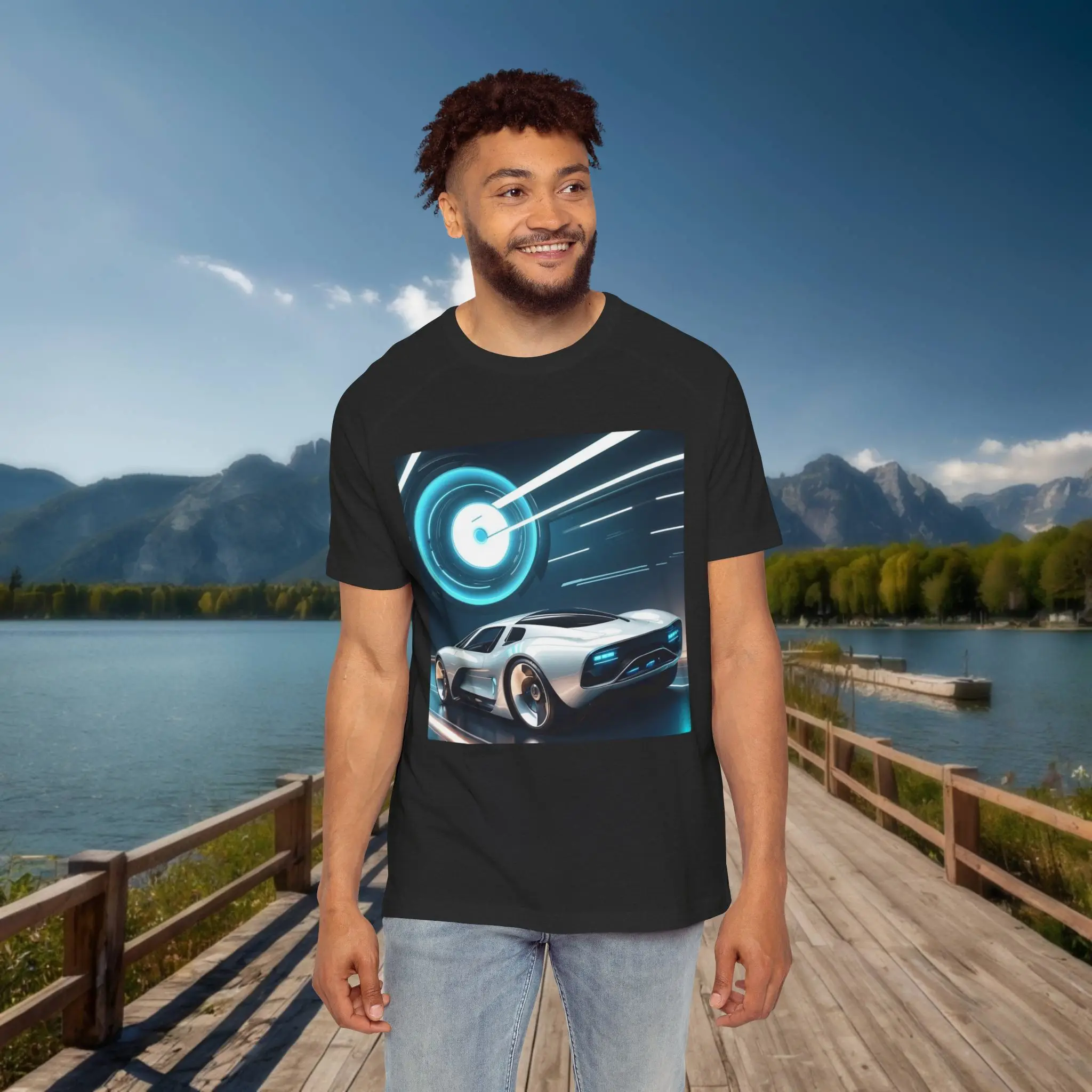 Discover Speed and Style with Exyashop’s Men’s Raglan T-Shirt: Retro Futuristic Car Theme
