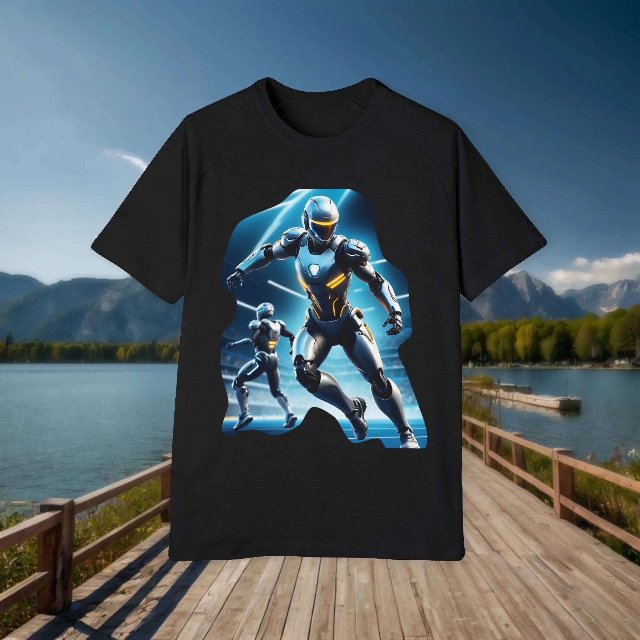 Black T-shirt with a futuristic armored figure in blue. A modern and stylish choice for those who love cutting-edge design.