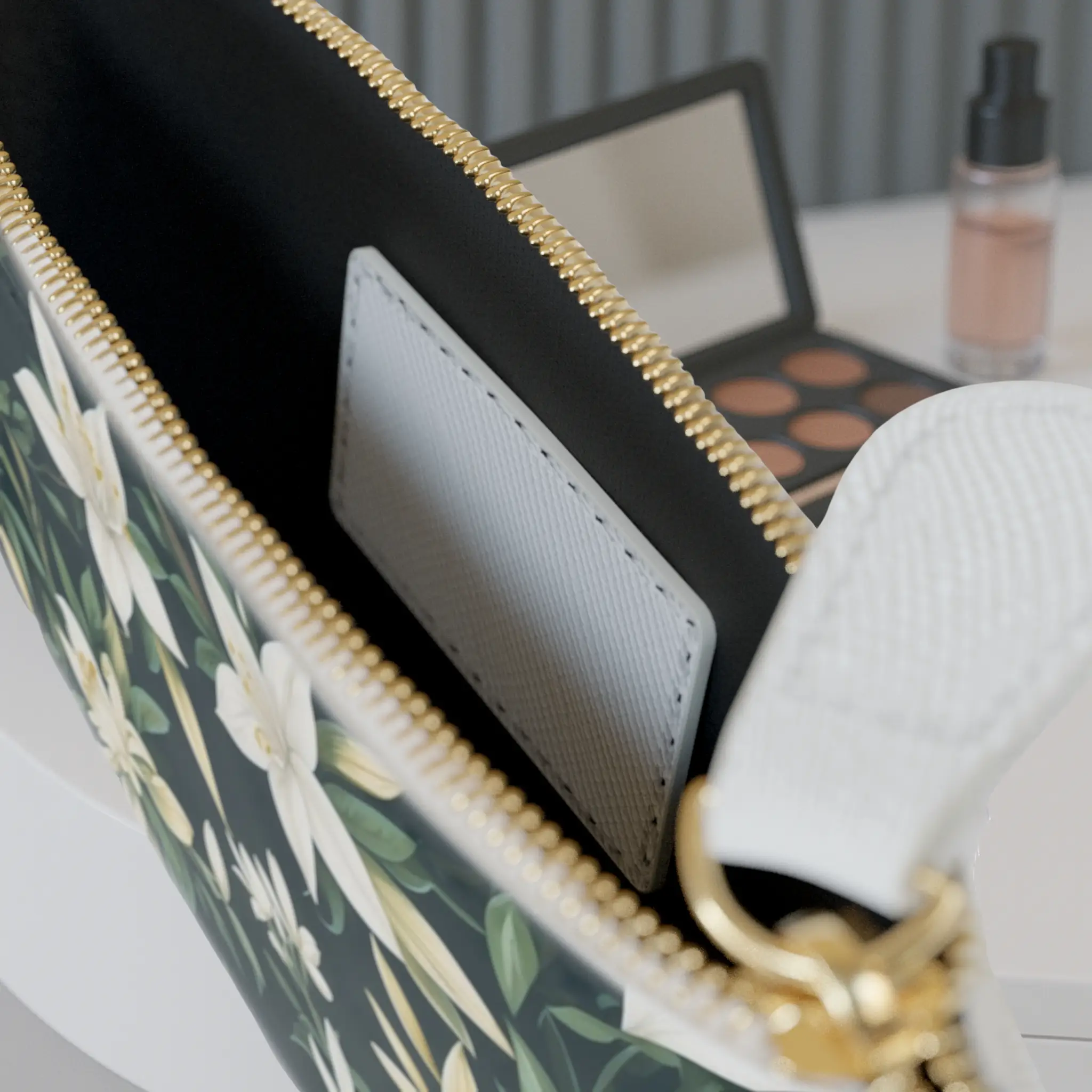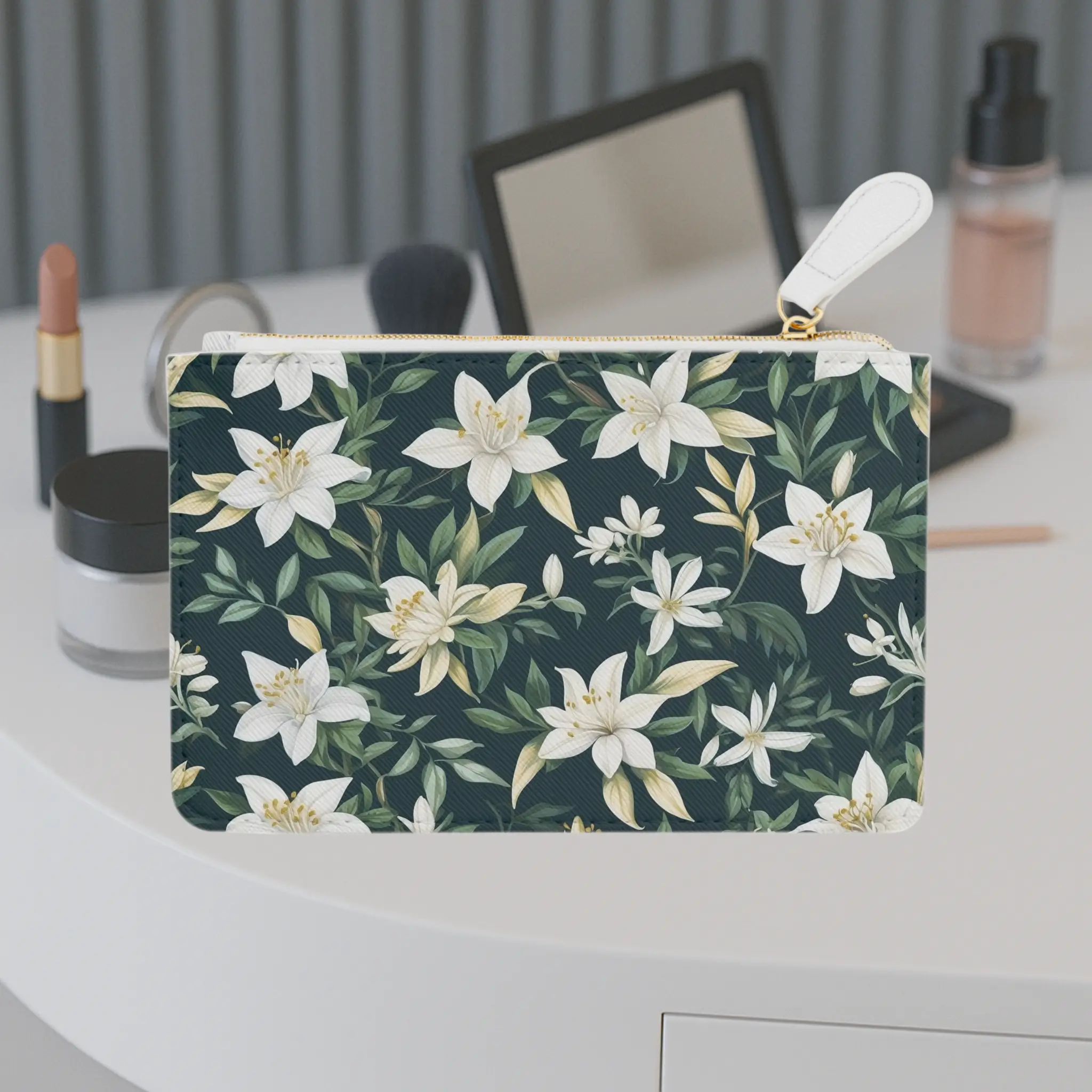Introducing the Mini Clutch Bag from ExyaShop, featuring an exquisite jasmine design. This beautiful pattern showcases delicate jasmine flowers set against a dark, elegant background, capturing their natural charm and sophistication. Perfect for any occasion, this clutch bag brings a touch of floral elegance to your accessory collection.