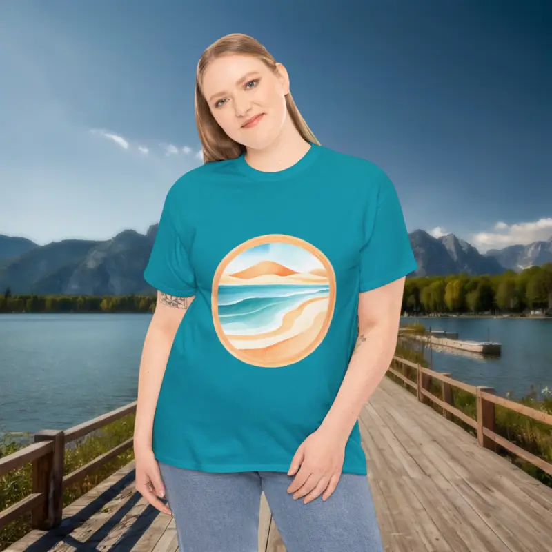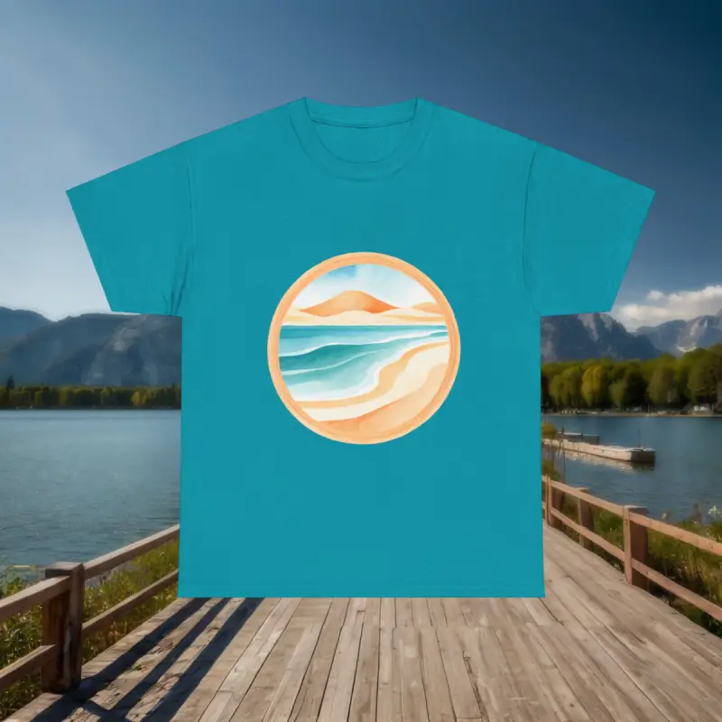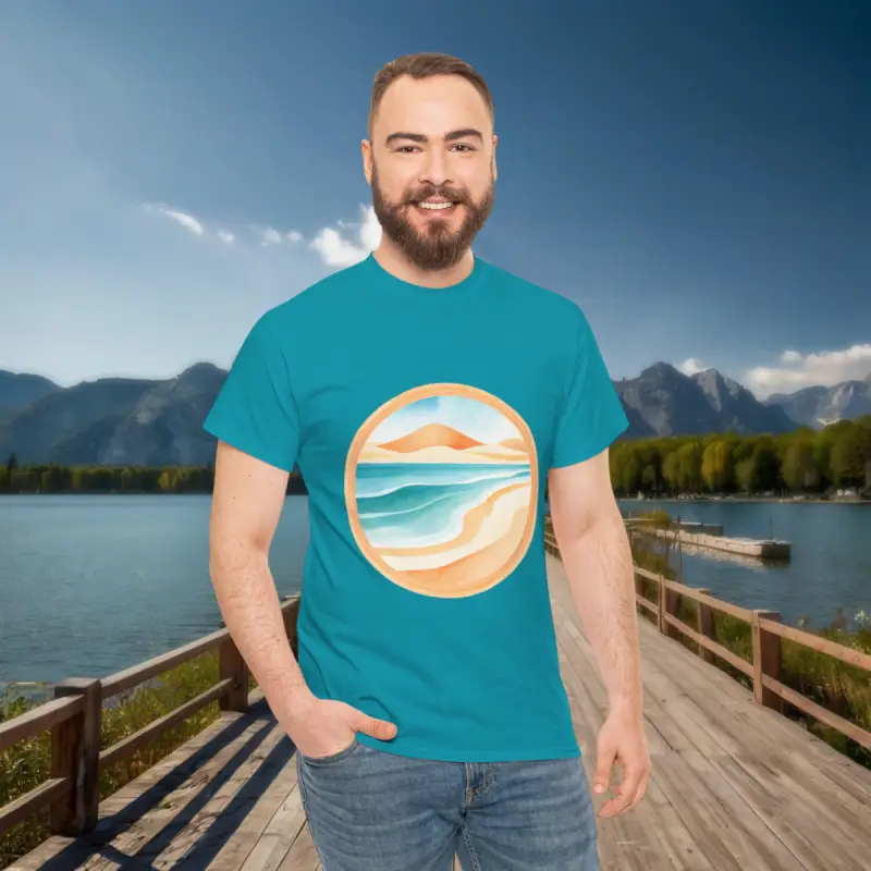 The Sandbanks T-Shirt is more than just a basic tee—it’s a statement piece. The circular design in the center draws attention while staying subtle enough for versatile styling. Pair it with neutral-toned bottoms for a minimalist look, or layer it under a light jacket for cooler days. Its lightweight feel ensures comfort throughout the day, whether you’re indoors or out exploring.