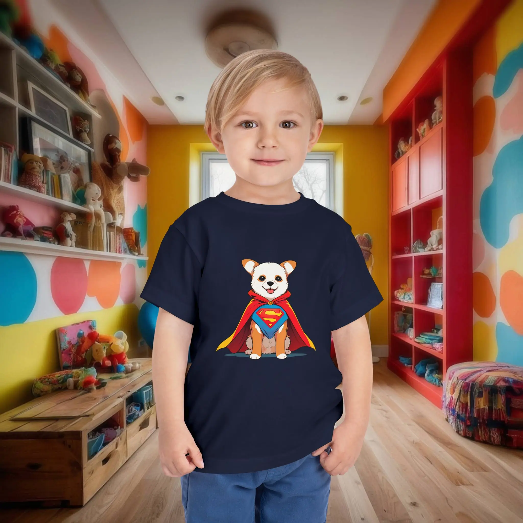 Green toddler tee featuring a vibrant superhero dog design with a colorful cape. Soft and durable, perfect for everyday heroics.