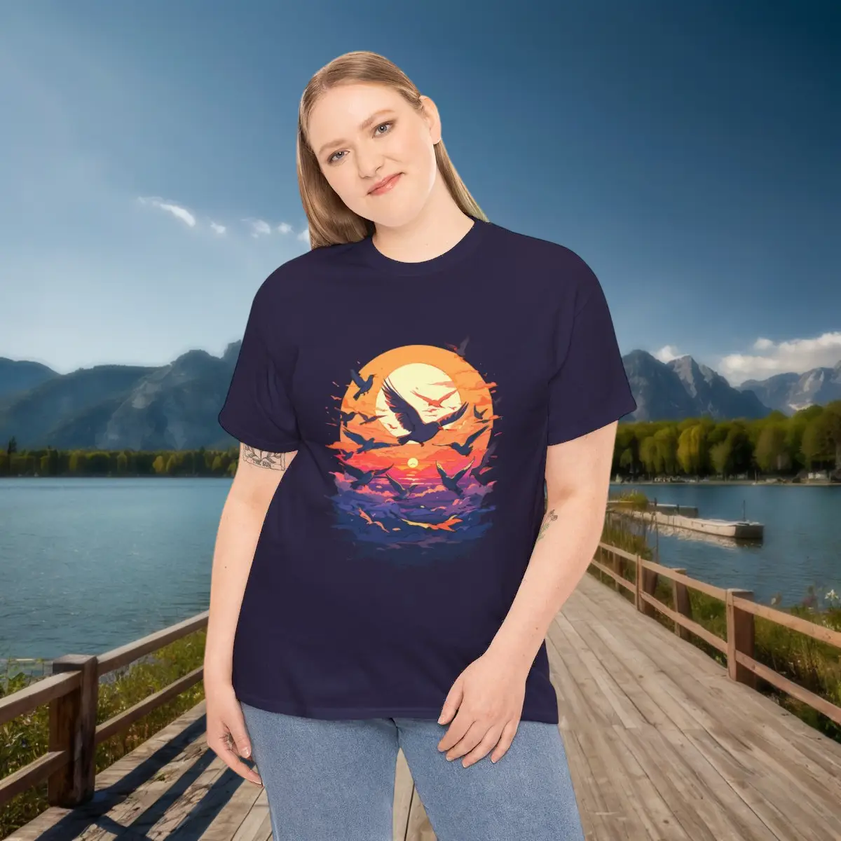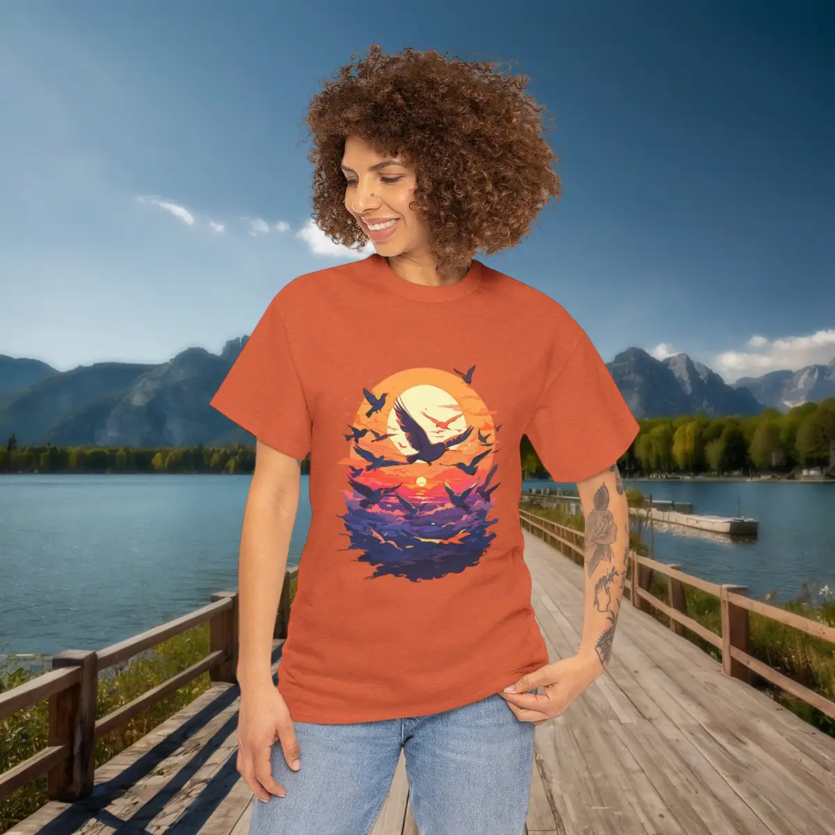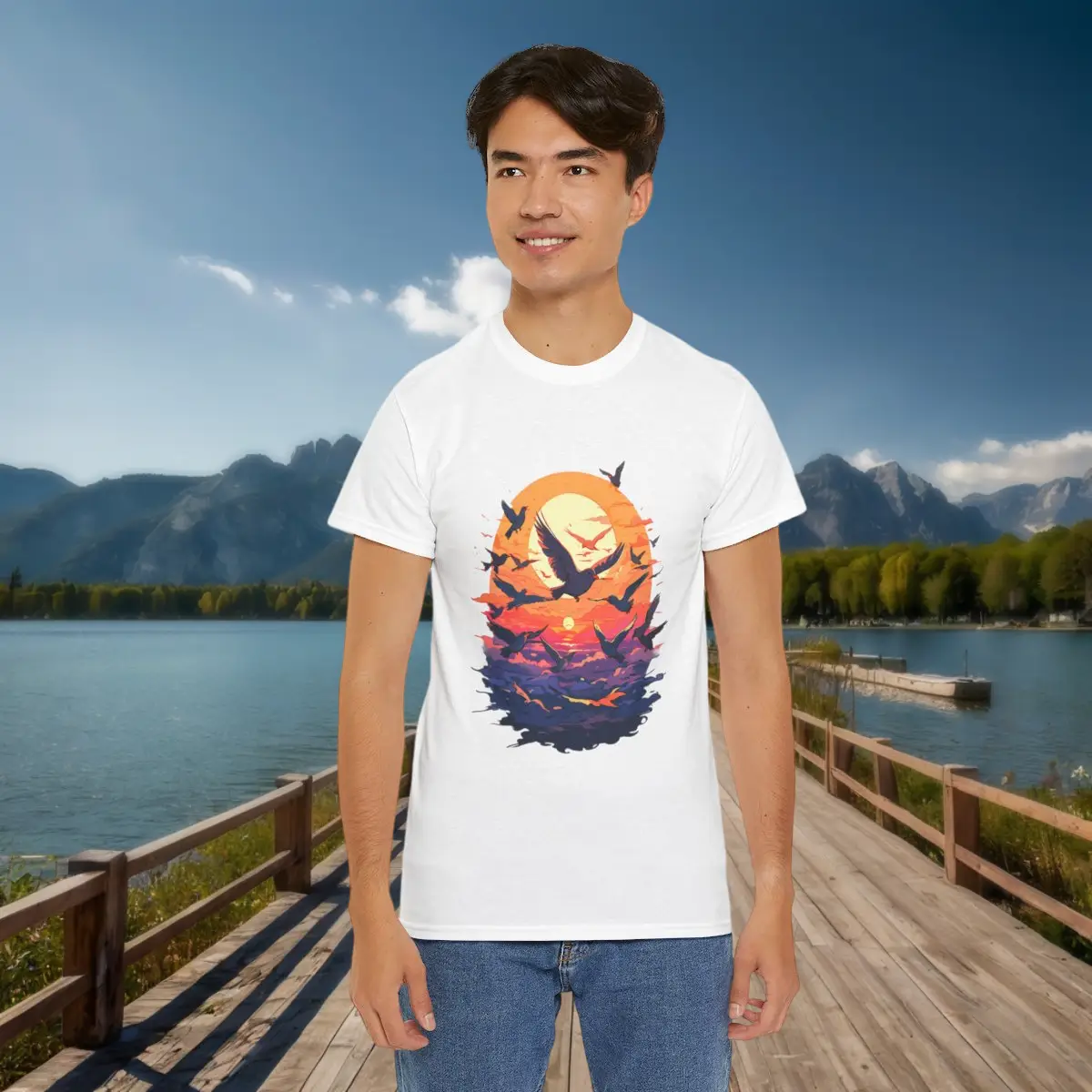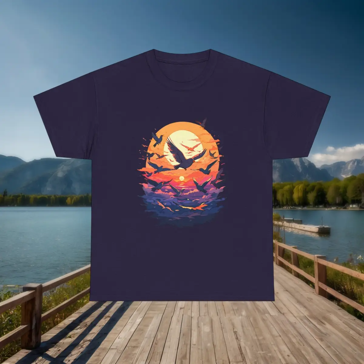 Unisex tee with a majestic birds flying at sunset design, ideal for fans of serene and nature-inspired styles. Comfortable and stylish for any casual occasion.