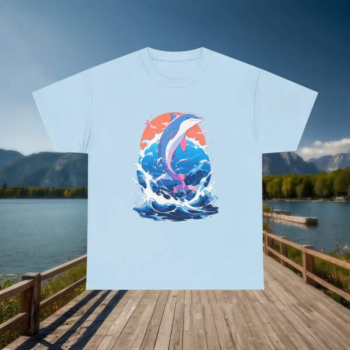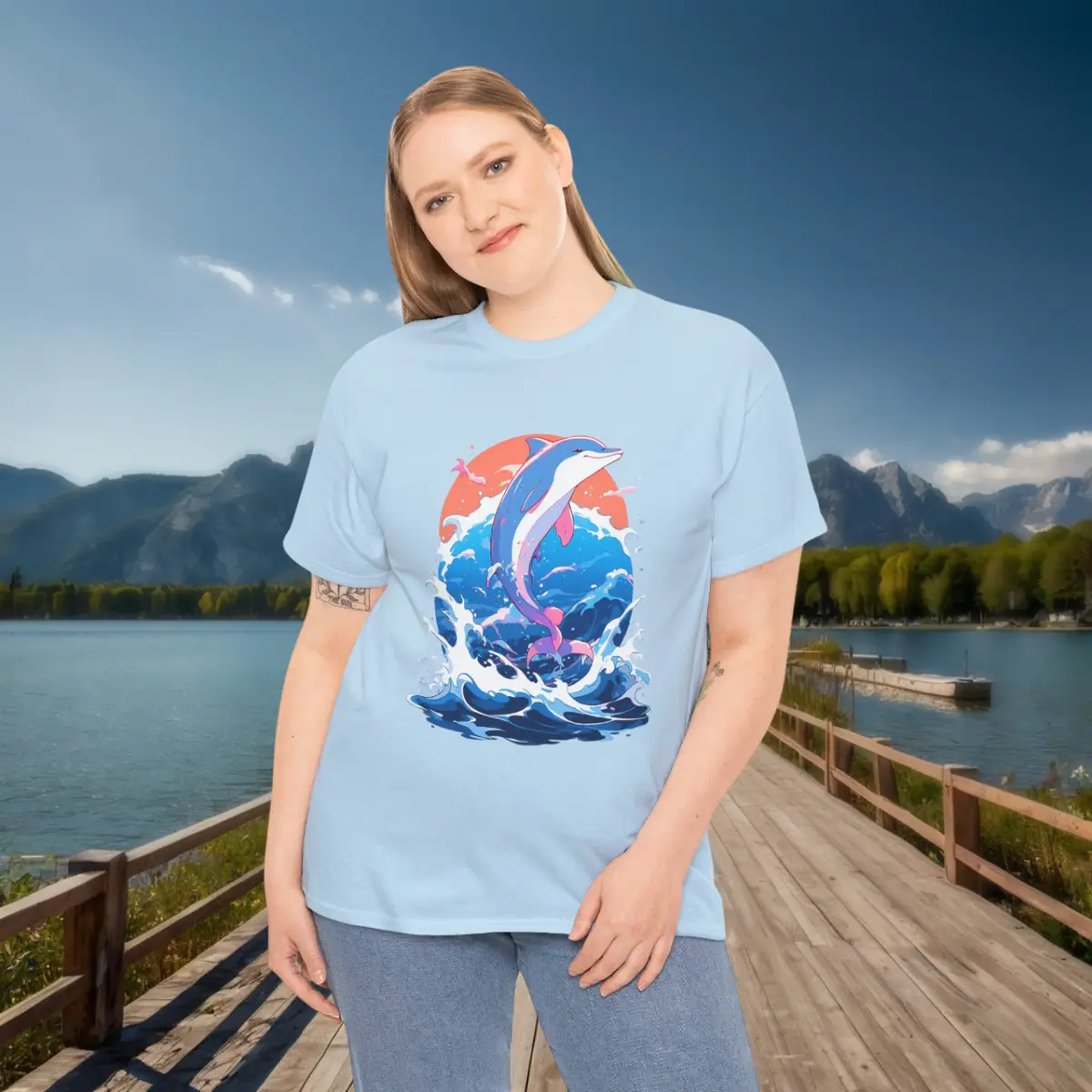 The centerpiece of this unisex cotton tee is its vivid graphic, depicting a dolphin soaring gracefully through the waves with the backdrop of a warm, glowing sunset. The rich blues of the ocean contrast beautifully with the bright, warm tones of the sky, creating a scene that’s both lively and captivating.