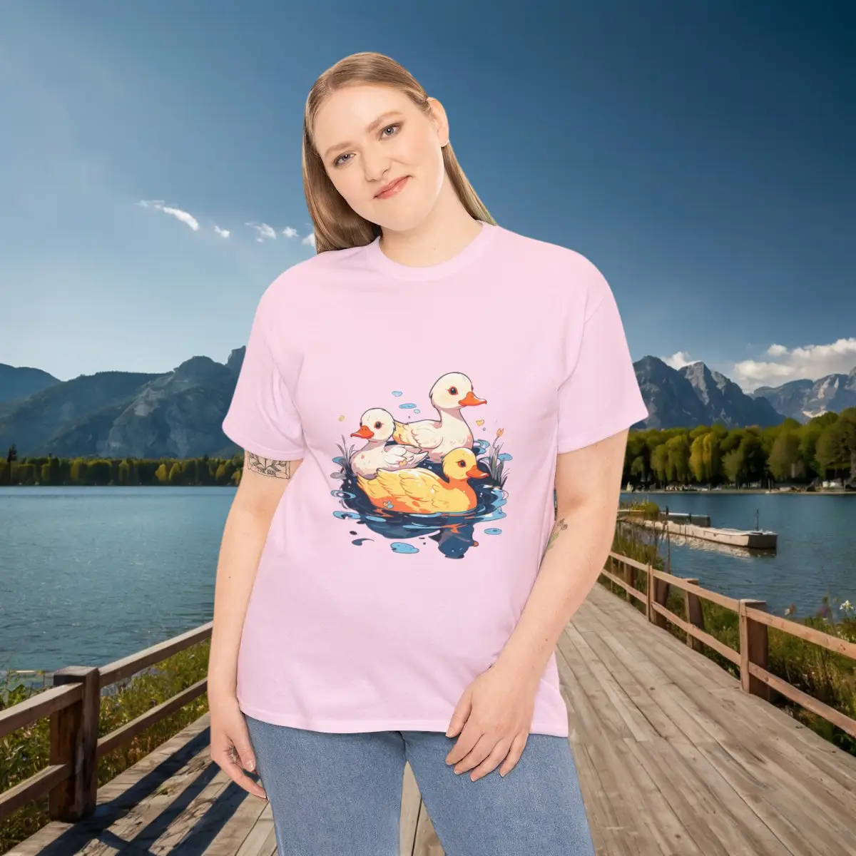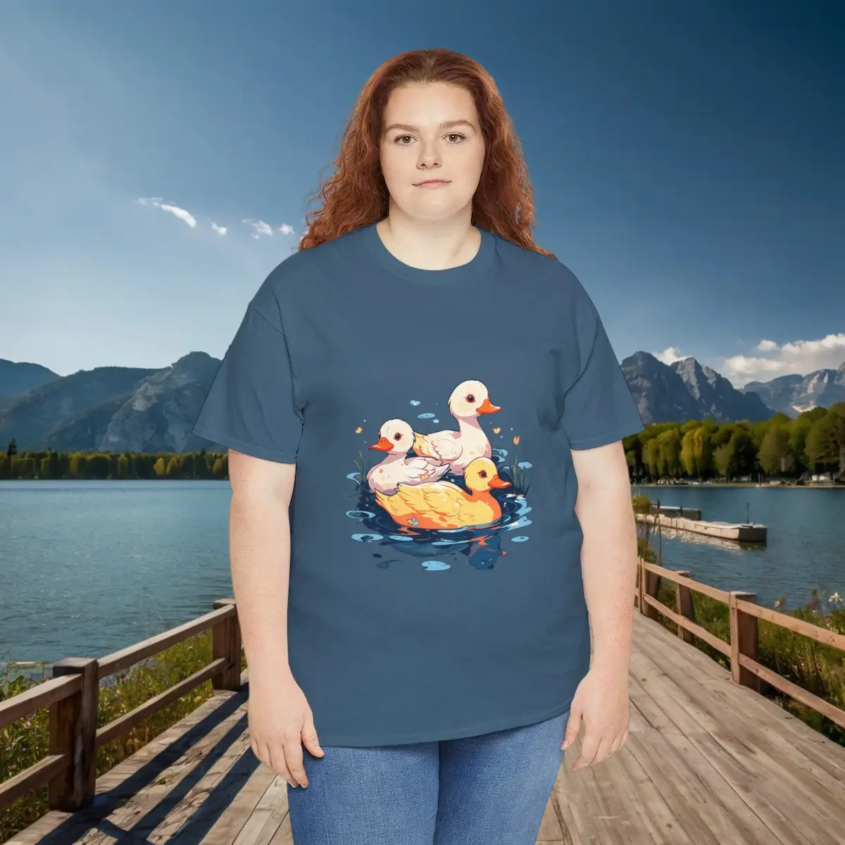 The heart of this unisex cotton tee lies in its charming graphic, depicting a trio of ducks happily floating on a serene pond. The soft colors and playful scene capture the simplicity and joy of nature, making this tee perfect for animal lovers or anyone who appreciates a light-hearted design. This tee isn’t just clothing—it’s a little piece of nature’s charm that you can wear.