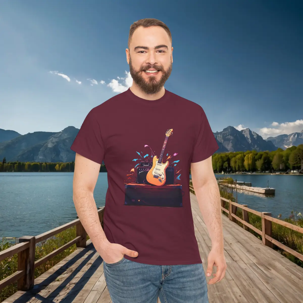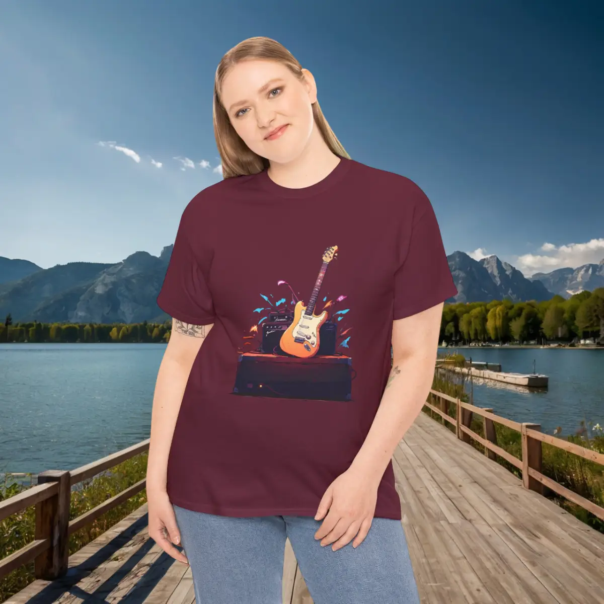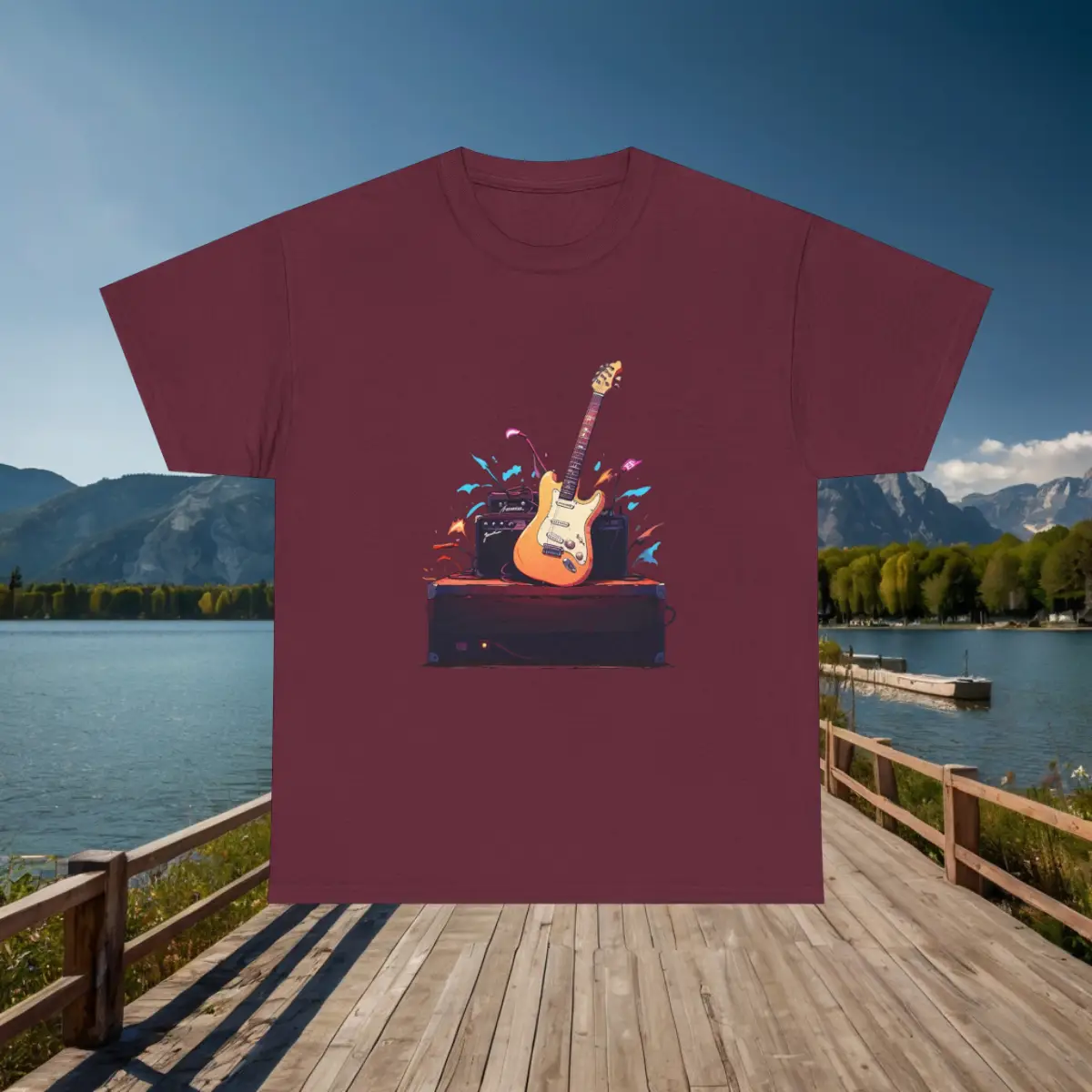 Unisex heavy cotton tee with an electric guitar on an amplifier design. Vibrant, musical, and comfortable, ideal for music enthusiasts.