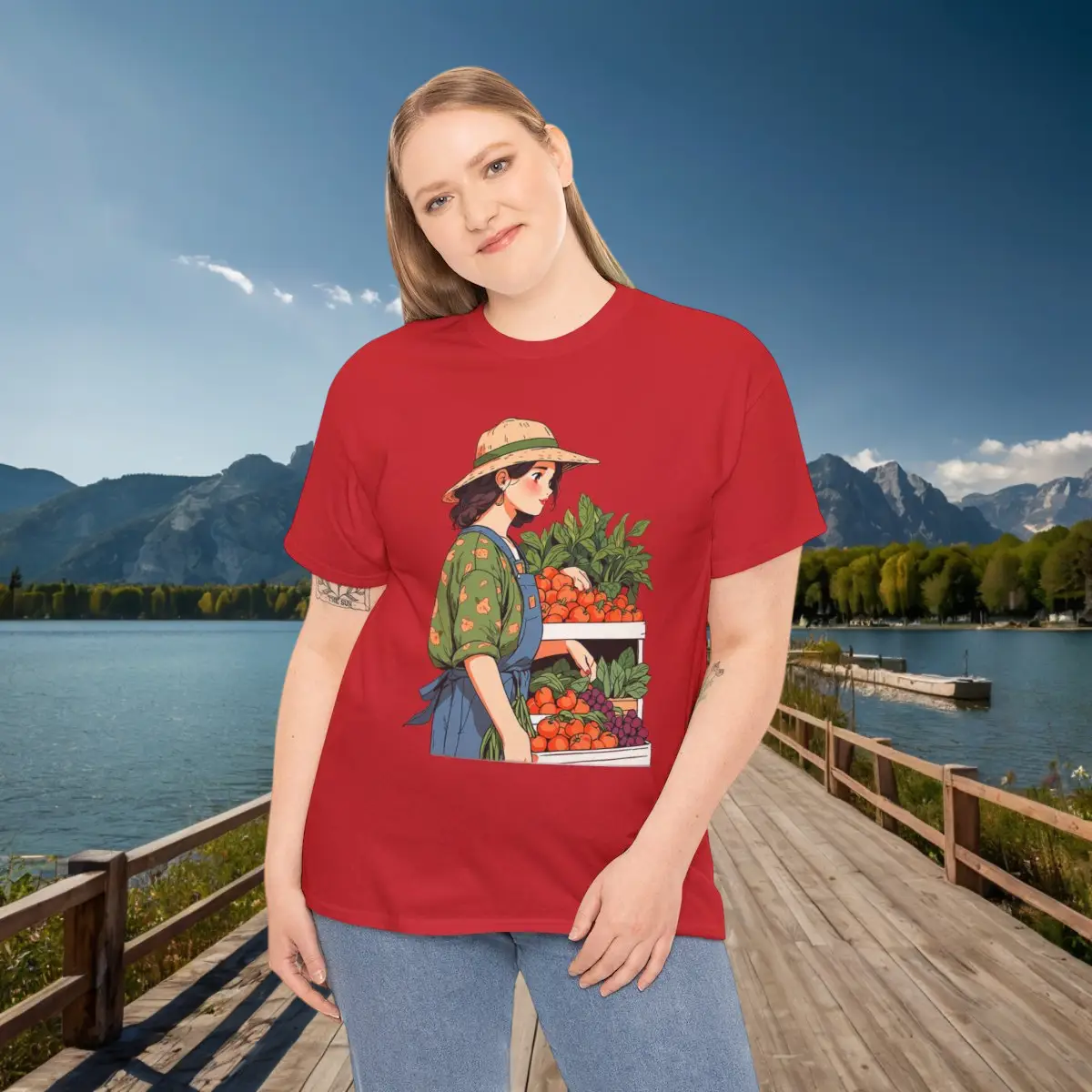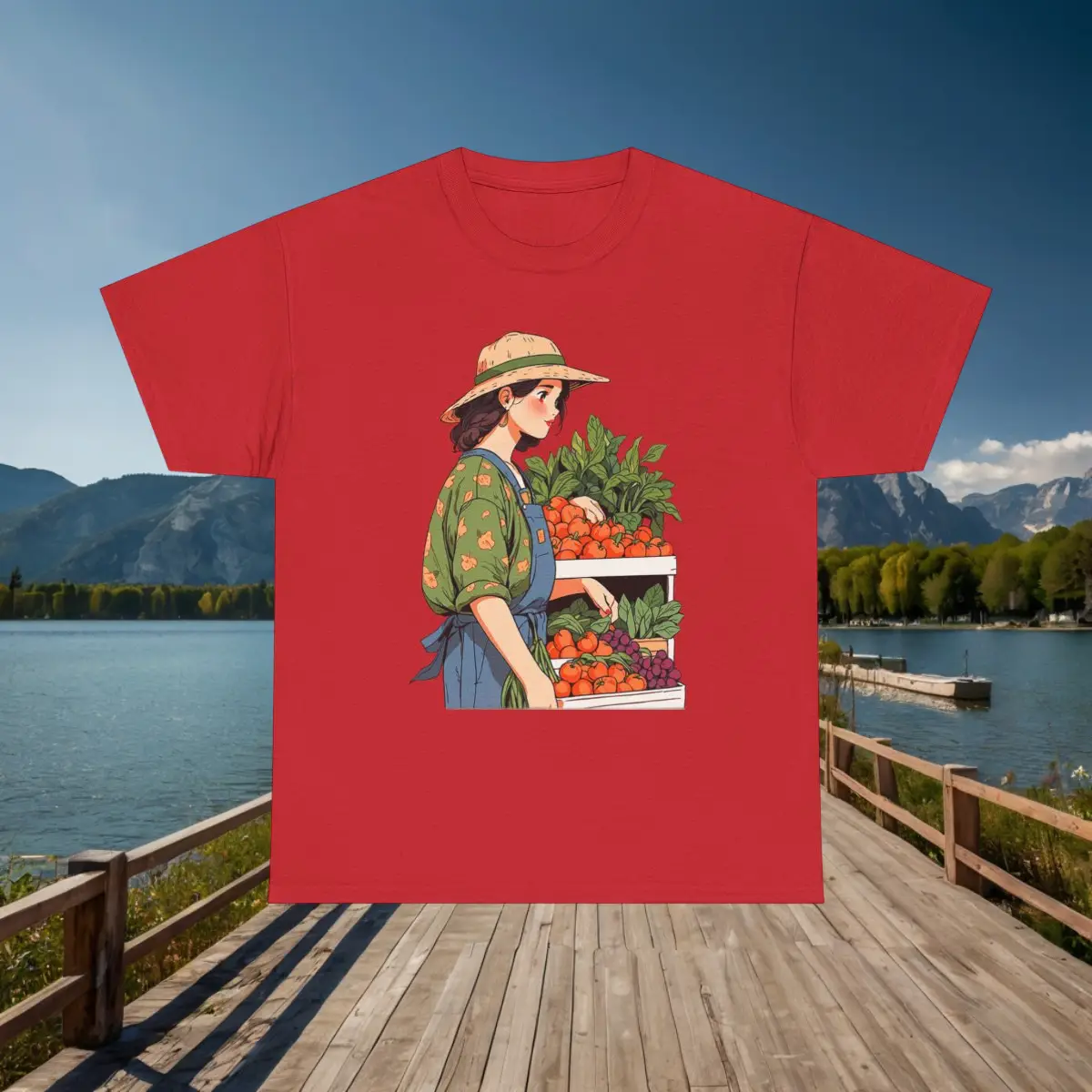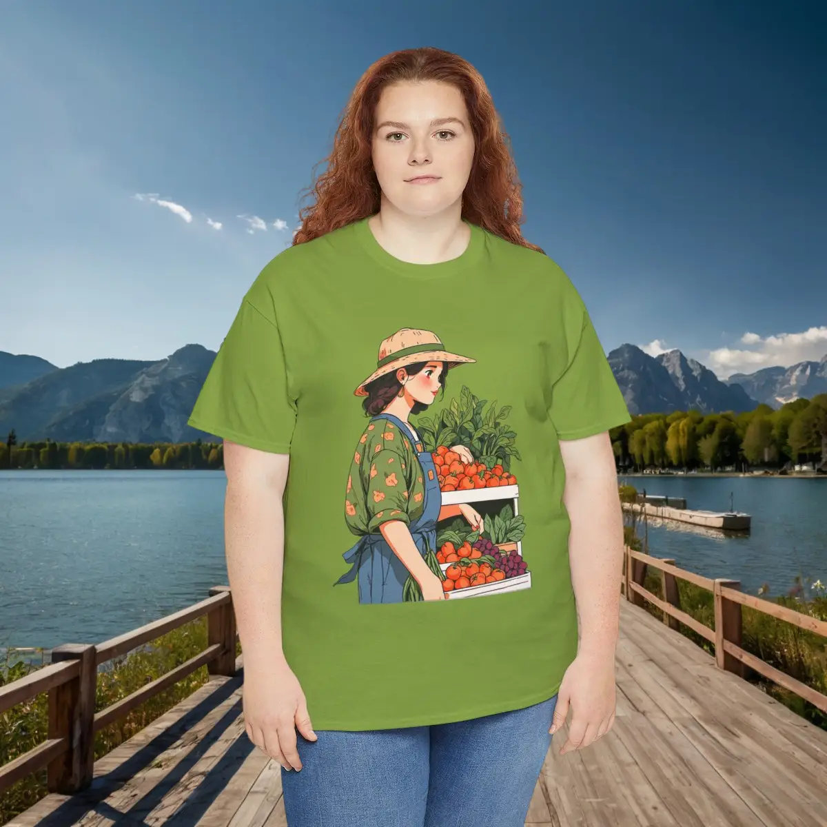 The standout feature of this heavy cotton tee is the beautiful graphic design of a farmer at the market. With vibrant colors and intricate details, the image evokes the simplicity and joy of a day spent among fresh fruits and vegetables. This design isn’t just for market lovers—it’s for anyone who appreciates the beauty in everyday moments.