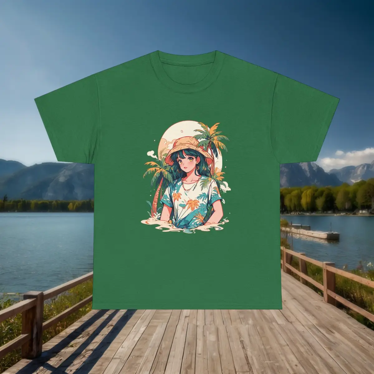 The Pristine beach graphic is the star of this tee, featuring a peaceful scene of a girl enjoying a sunny day on a tropical beach. The lush palm trees, crystal-clear waters, and bright, warm colors capture the essence of a perfect day at the beach, bringing a slice of paradise to your everyday life.