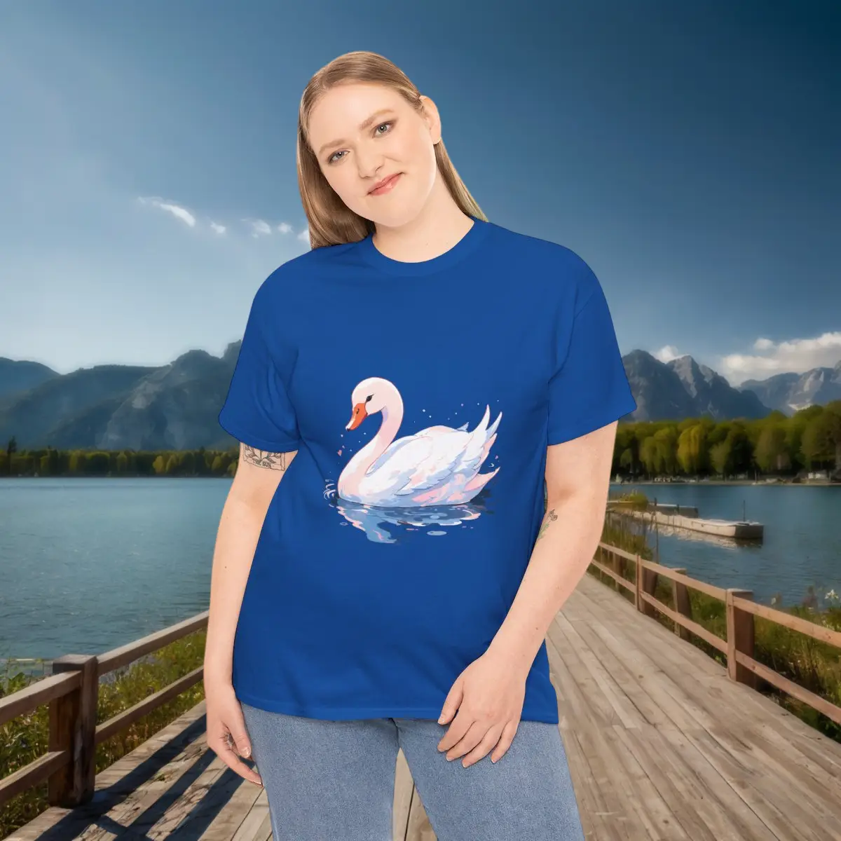 Crafted from premium cotton, this unisex tee offers a soft, comfortable fit that is perfect for everyday wear. The Swan design, featuring a majestic swan gliding gracefully across a tranquil body of water, is printed with high precision to capture every delicate detail.