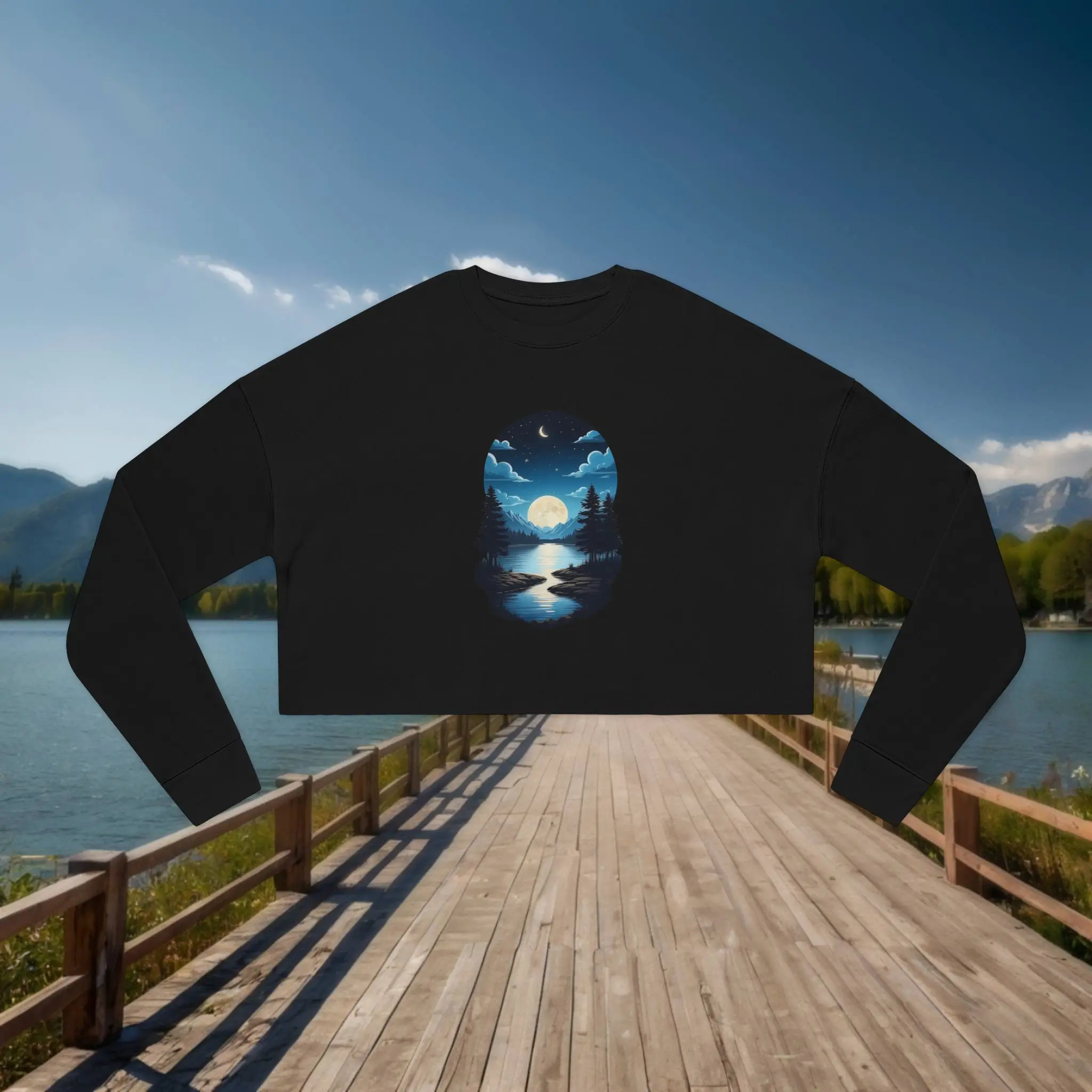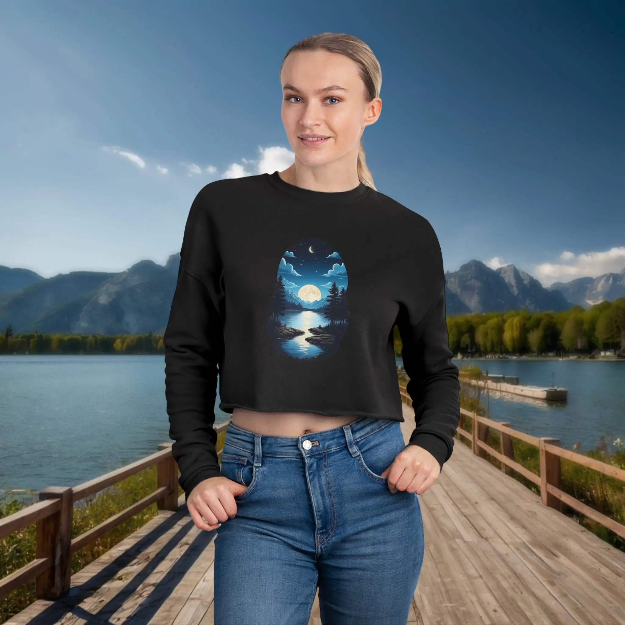 Women’s Cropped Sweatshirt with Moonlit Lake Design: A Perfect Blend of Comfort and Style