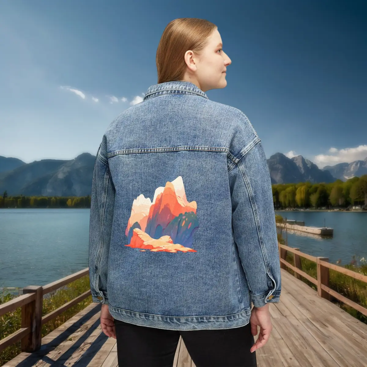 Enhance your wardrobe with the stylish Women’s Denim Jacket from Exyashop. Featuring a relaxed, oversized fit and a breathtaking Canyon Vista design on the back, this jacket combines the rugged beauty of natural landscapes with contemporary fashion.