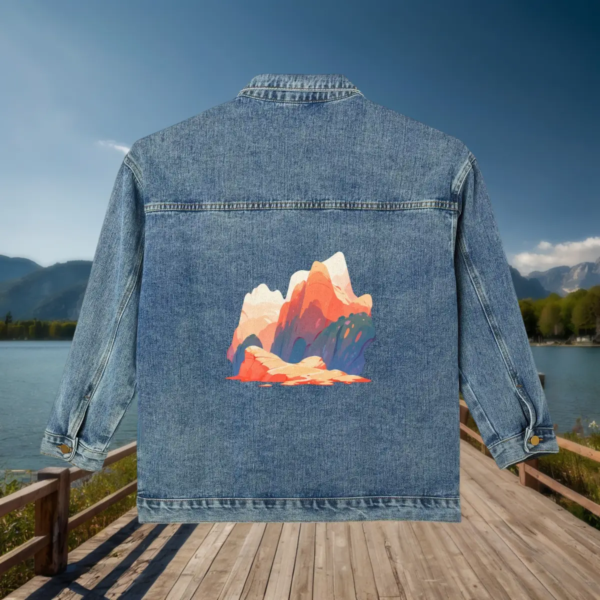 The standout feature of this Women’s Denim Jacket is the stunning Canyon Vista design on the back. This captivating artwork, depicting a majestic canyon scene with vibrant colors, adds a touch of natural grandeur and artistic elegance, making the jacket a unique fashion statement.