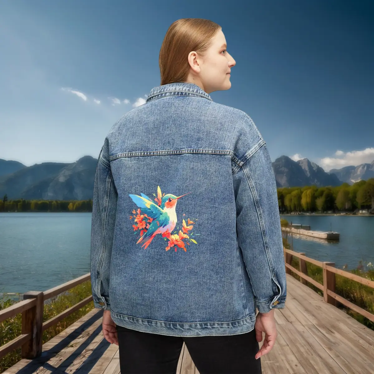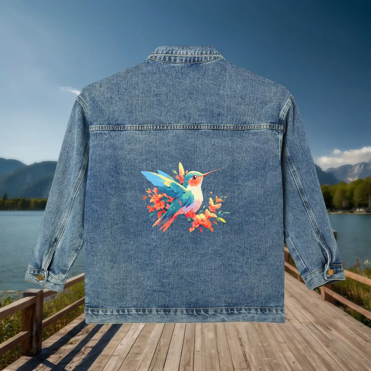 A standout feature of this Women’s Denim Jacket is the vibrant hummingbird design on the back. This artistic element adds a modern twist to the classic denim jacket, making it a distinctive piece that draws attention and compliments. The hummingbird design symbolizes beauty and resilience, adding a unique and stylish touch to your wardrobe.