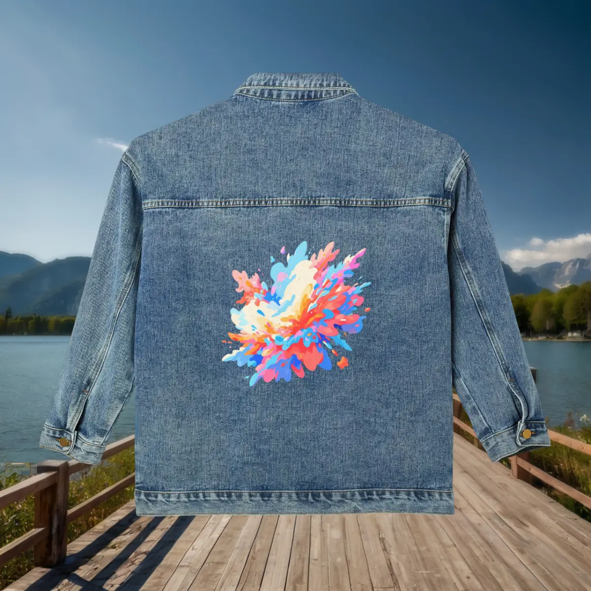 A standout feature of this Women’s Denim Jacket is the vibrant kaleidoscopic shapes design on the back. This artistic element adds a modern twist to the classic denim jacket, making it a distinctive piece that draws attention and compliments. The kaleidoscopic shapes symbolize creativity and modernity, adding a unique and stylish touch to your wardrobe.