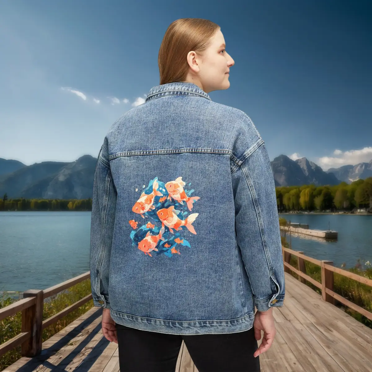 Enhance your wardrobe with the stylish Women’s Denim Jacket from Exyashop. Featuring a relaxed, oversized fit and a beautiful Koi Fish design on the back, this jacket blends artistic elegance with contemporary fashion.