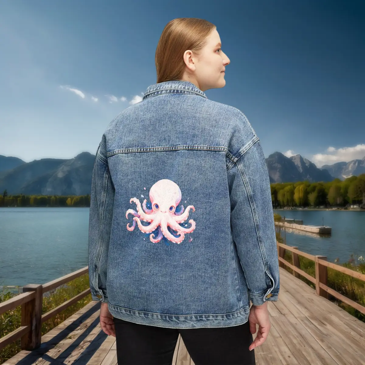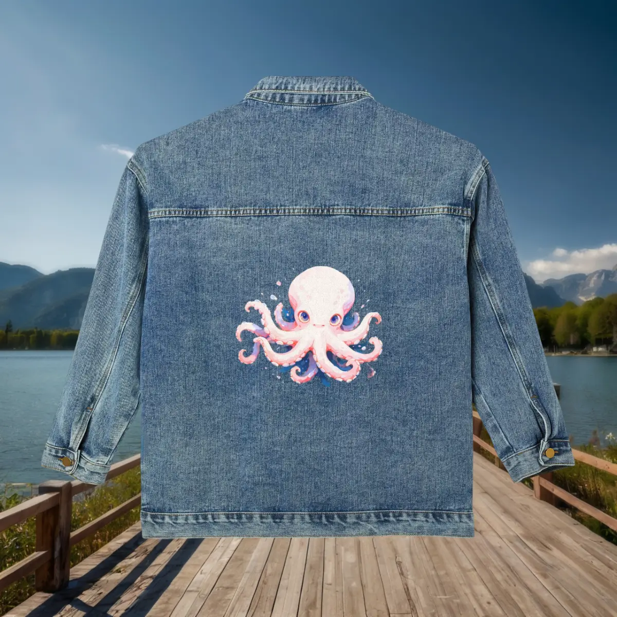 Introducing the Women’s Denim Jacket from Exyashop, featuring an adorable octopus graphic. This unique design adds a whimsical touch to your wardrobe, perfect for expressing your love for marine life and adventure.