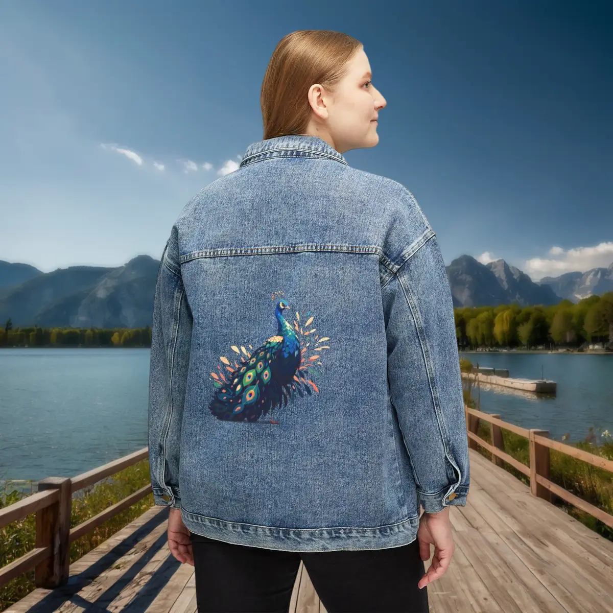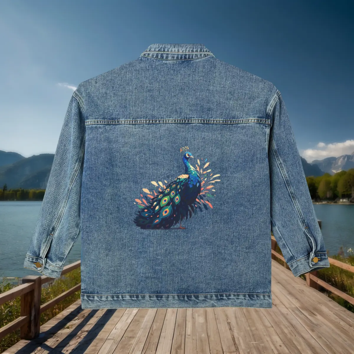 A standout feature of this Women’s Denim Jacket is the vibrant peacock design on the back. This artistic element adds a modern twist to the classic denim jacket, making it a distinctive piece that draws attention and compliments. The peacock design symbolizes beauty and elegance, adding a unique and stylish touch to your wardrobe.