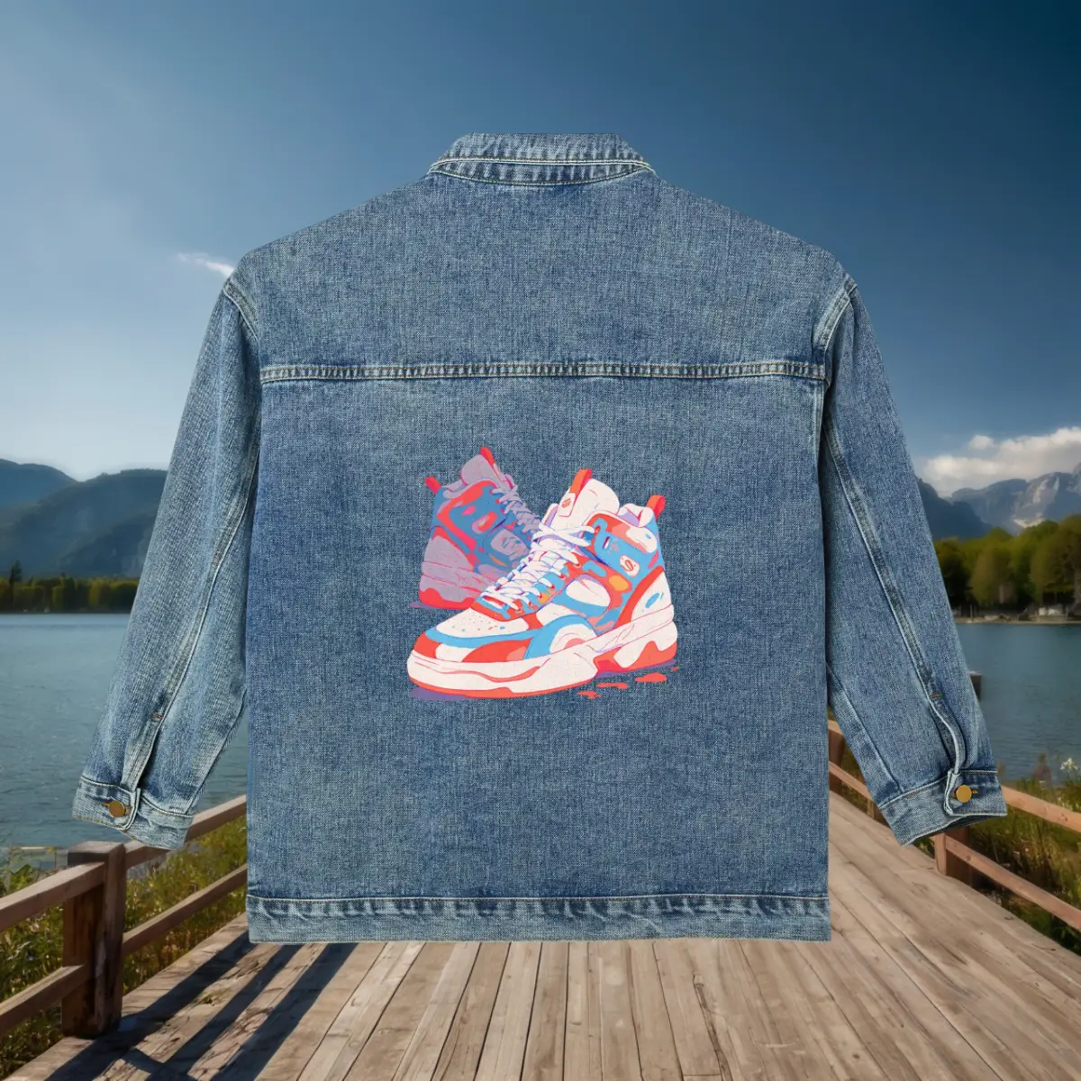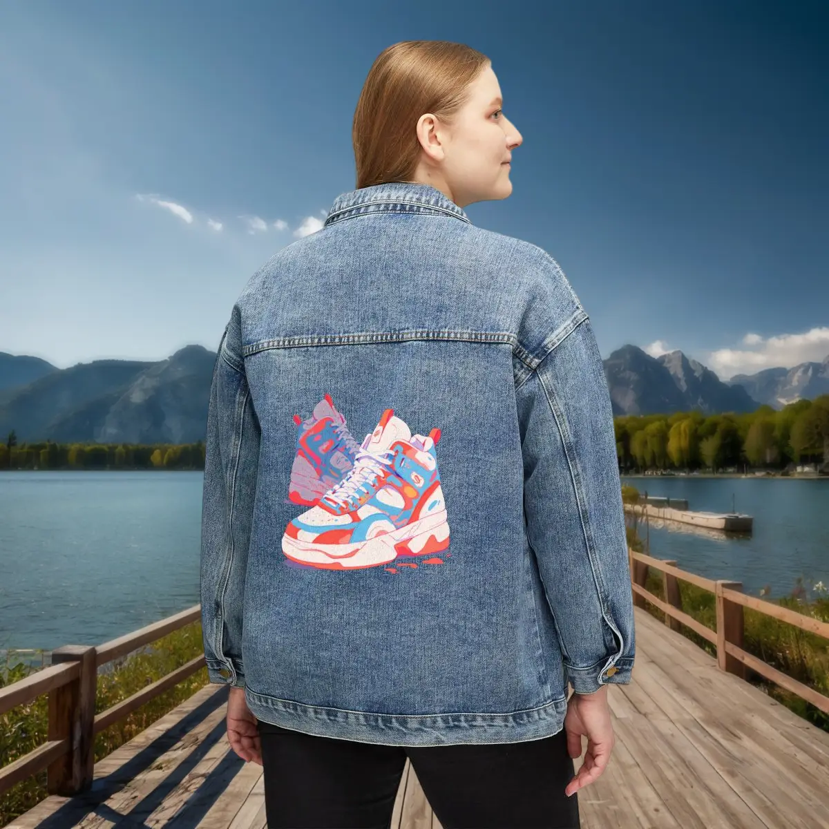 The highlight of this Women’s Denim Jacket is the eye-catching sneakers design on the back. This vibrant illustration brings a fun, sporty feel to the classic denim jacket, making it a unique addition to your wardrobe.
